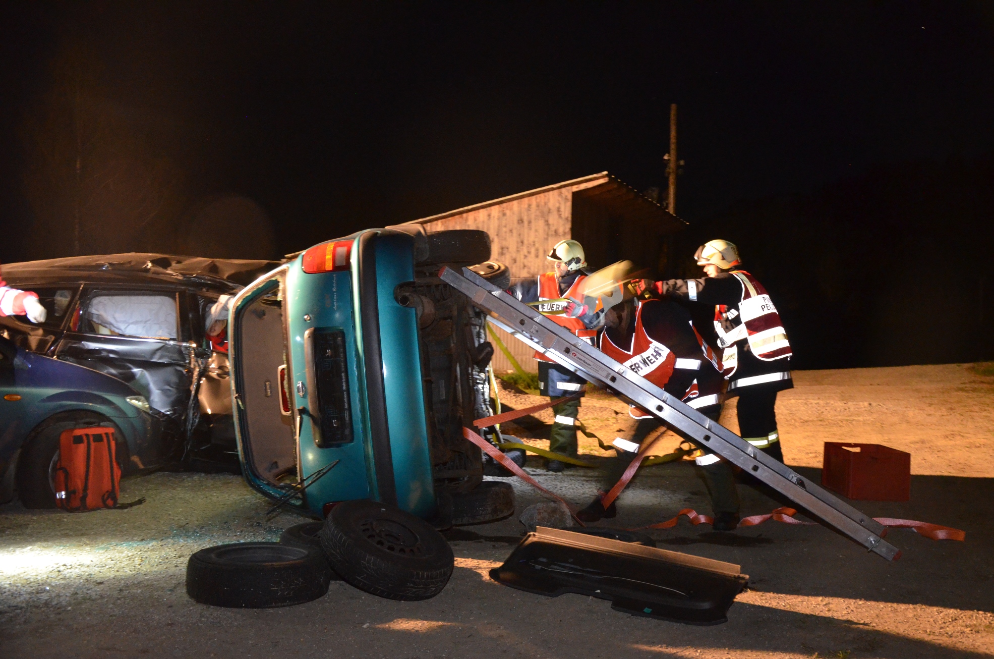 Bei der Monatsübung im Oktober, mussten gleich zwei Einsatzszenarien abgearbeitet werden. Gestartet wurde mit einem Verkehrsunfall von 3 Fahrzeugen und zwei eingeklemmten Personen. Nachdem diese geborgen waren, fing eines der Fahrzeuge Feuer. Die eingesetzte Mannschaft löschte den Brand innerhalb von wenigen Minuten und stellte durch Nachkontrolle mit der Wärmebildkamera sicher, dass sämtliche Glutnester abgelöscht waren.