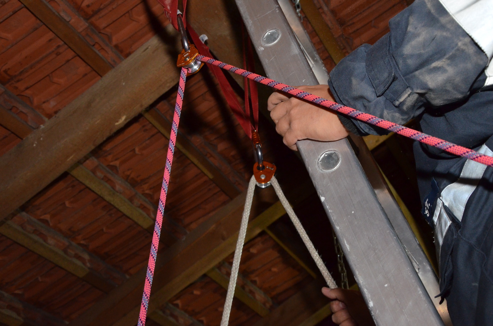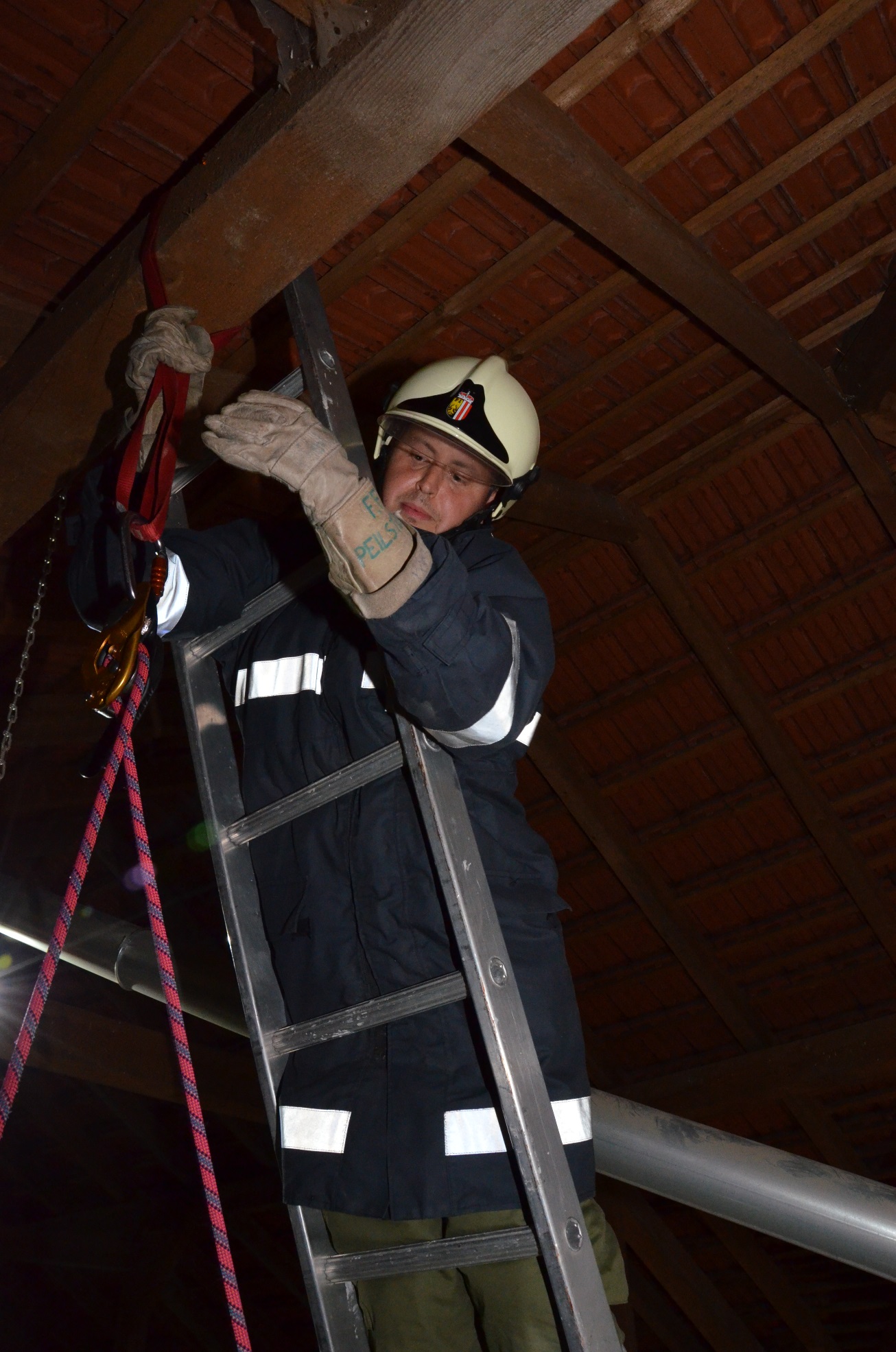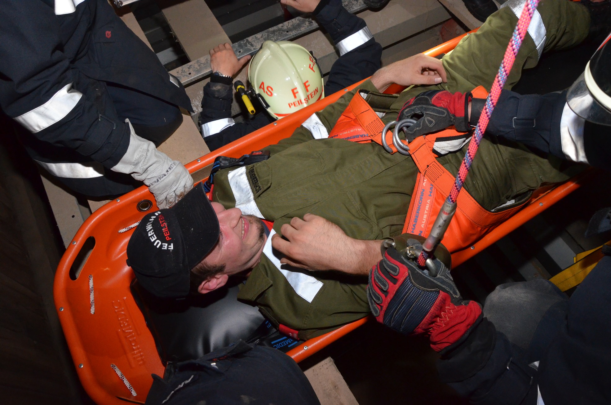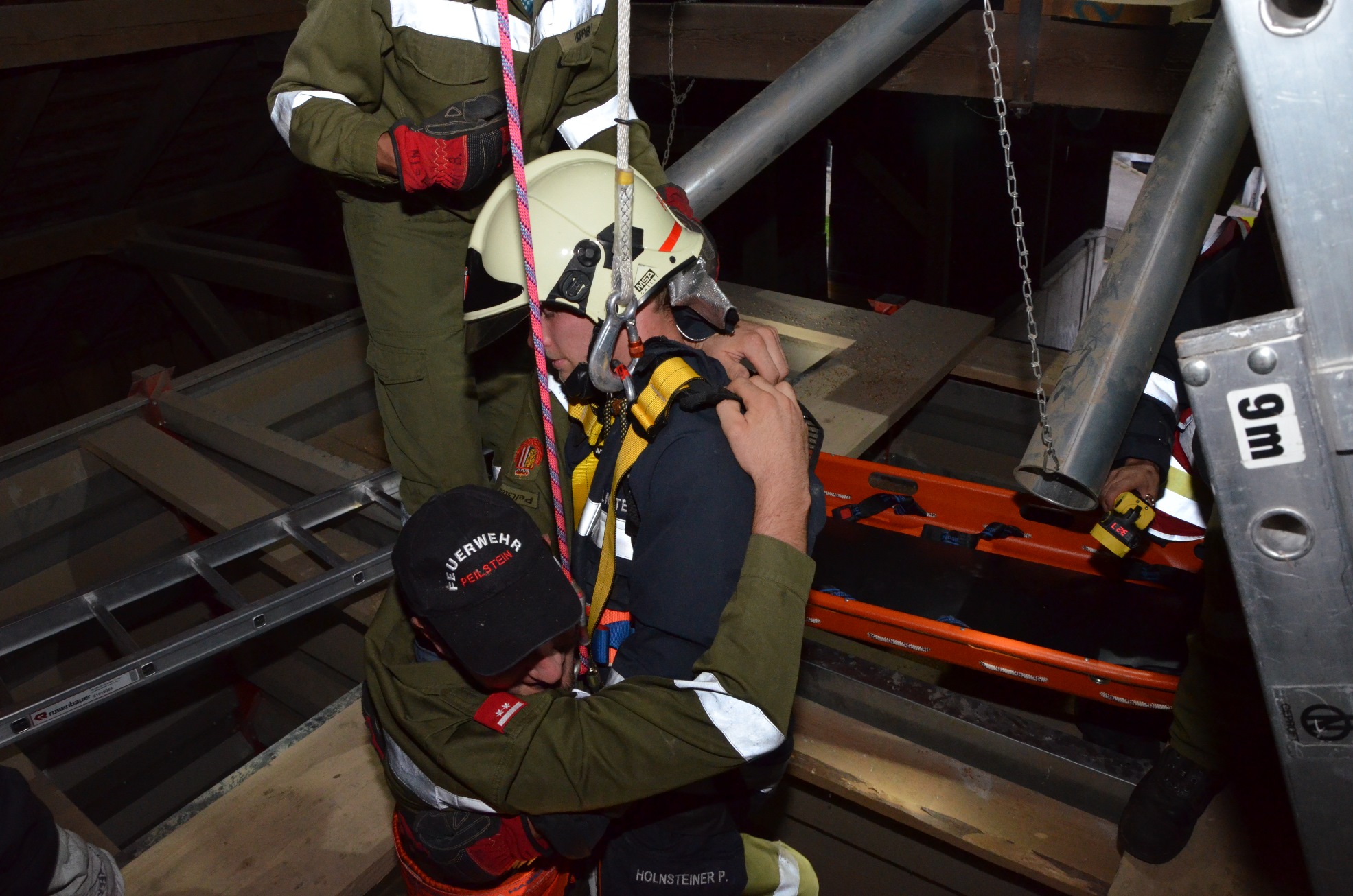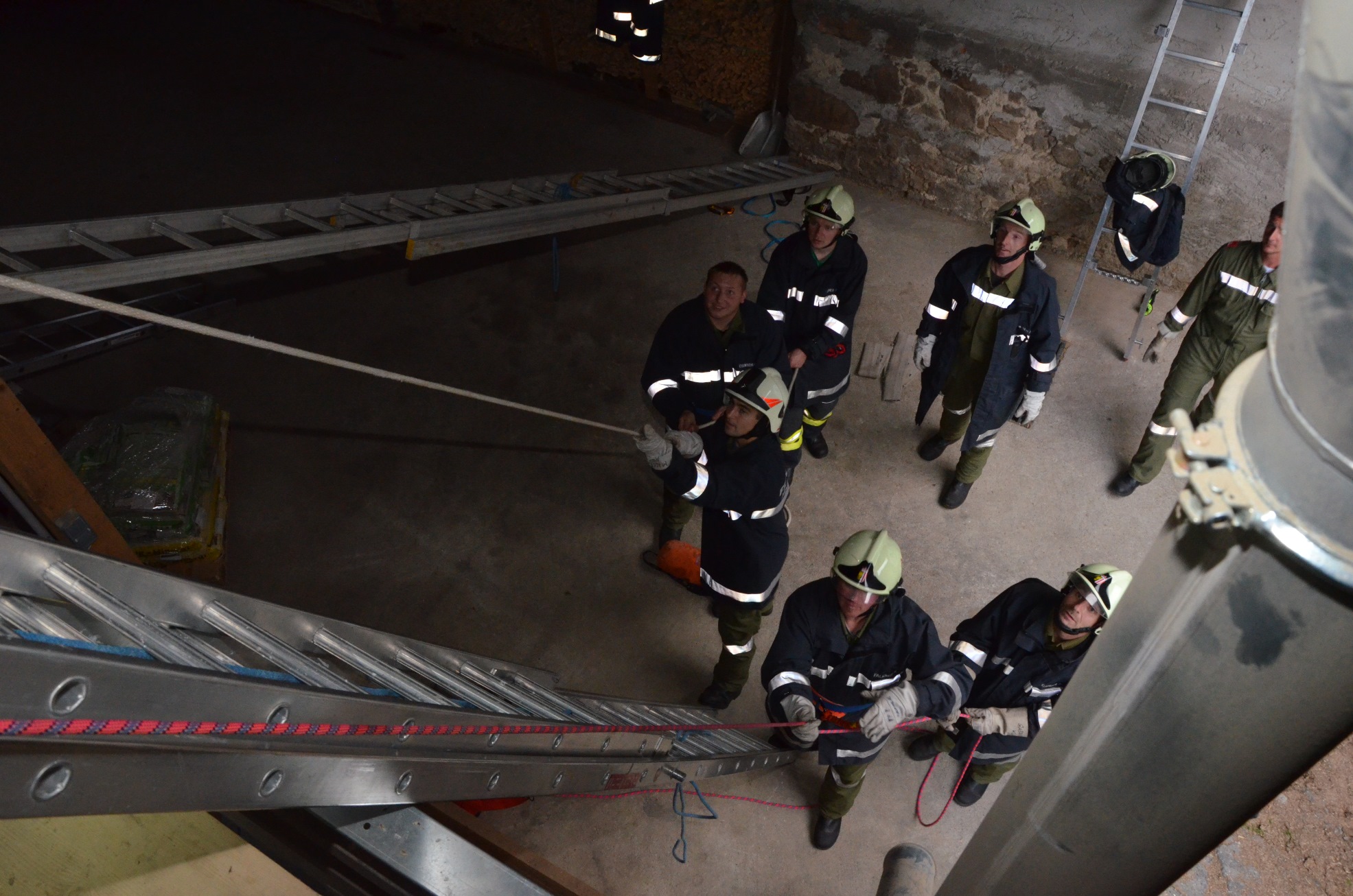 Mittels 4-teiliger Steckleiter sind die Retter zur verunfallten Person vorgedrungen. Diese wurden dann gemeinsam mit einem Ersthelfer mittels Umlenkrollen und Seilen aus der mißlichen Lage befreit.